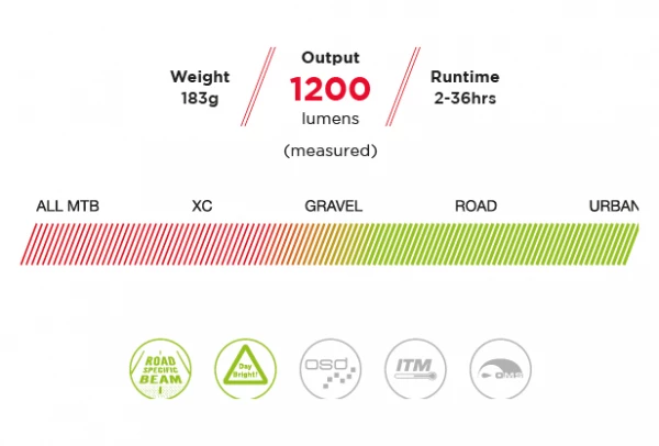 - Road Specif Beam : S’inspirant de la technologie des phares de voiture, les doubles lentilles permettent un faisceau optimal pour le cyclisme sur route avec un faisceau plat pour la périphérie et un faisceau ponctuel éclairant la voie à suivre, qui peut être incliné pour le trafic venant en sens inverse avec l’interrupteur filaire monté sur le guidon inclus.