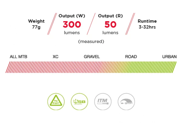 - Puissance maximale : 300 Lumens (avant) / 50 Lumens (arrière)