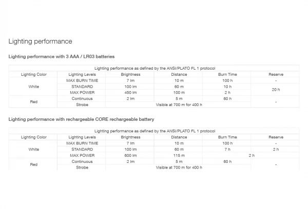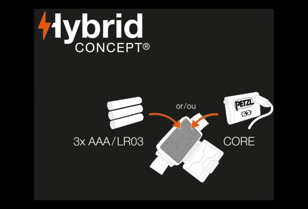 - Construction Hybrid Concept : livrée avec trois piles AAA/LR03, Actik est aussi compatible avec la batterie rechargeable Core (non fournie). La lampe détecte automatiquement la source d’énergie et ajuste les performances d’éclairage,
