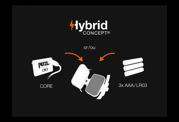 - construction HYBRID CONCEPT : livrée avec trois piles, IKO est aussi compatible avec la batterie rechargeable CORE. La lampe détecte la source d’énergie et ajuste les performances d’éclairage (IKO avec des piles = 350 lumens, IKO avec une batterie rechargeable CORE = 500 lumens),