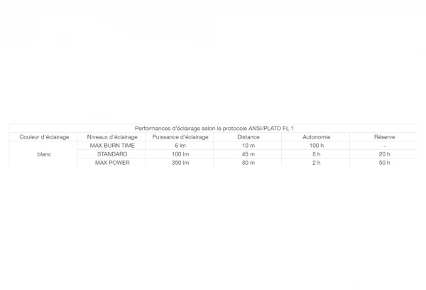 - Puissance : 350 lumens (ANSI-FL1 STANDARD)