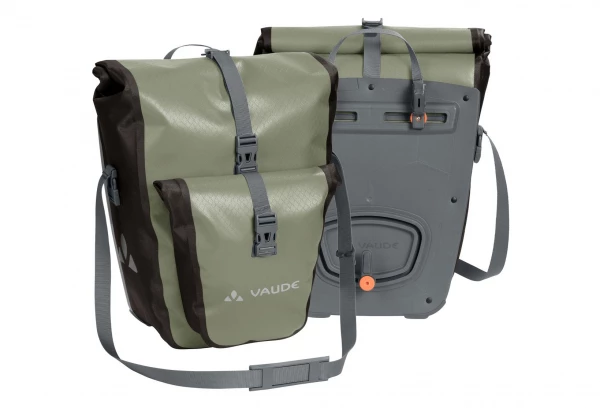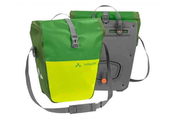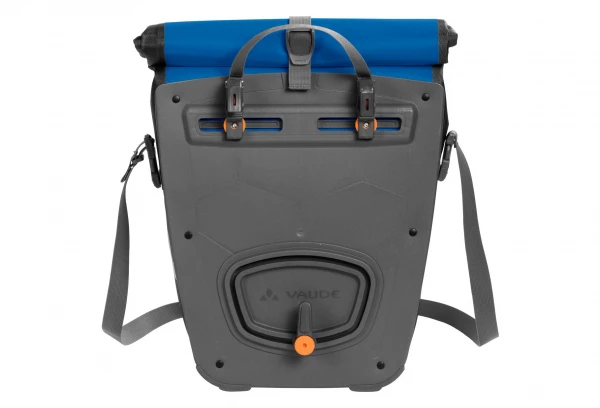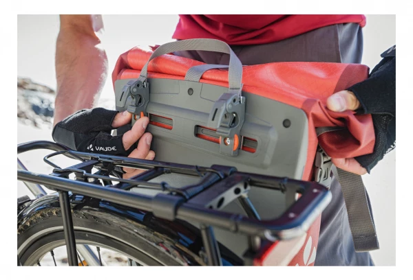 Cette sacoche étanche pour roue arrière Vaude Aqua, en bâche résistante sans PVC, est climatiquement neutre et fabriquée sur le site allemand de VAUDE au bord du lac de Constance. Elle n’attend que vous pour partir à l’aventure ! Grâce à une fermeture par enroulement totalement étanche, sa taille est ajustable et son contenu reste bien au sec. Une poche intérieure simple permet de bien ranger ses affaires. Ces sacoches sont fixées à droite et à gauche du porte-bagages arrière et stables grâce au système QMR 2.0 et à une plaque rigide. Elles sont ajustables à l’aide de petites roues et peuvent rapidement et facilement être fixées et enlevées. Elles peuvent être attachées directement au crochet QMR en utilisant tout simplement un cadenas à vélo. Des éléments réfléchissants garantissent une meilleure visibilité sur la route.