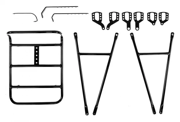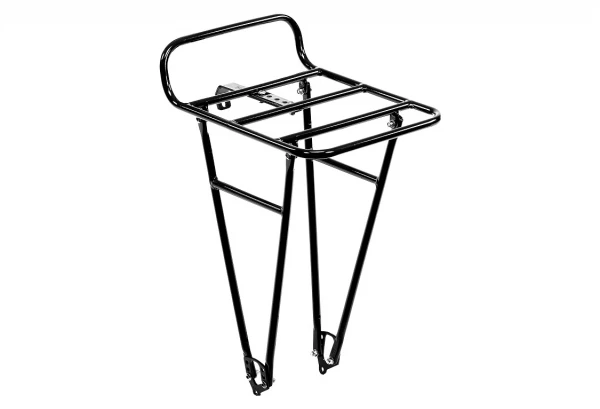 Porte-bagages avant en acier, avec plate-forme type porte-paquet, permet également d’accrocher des sacoches latérales, montage possible sur oeillets ou axe de la roue avant.