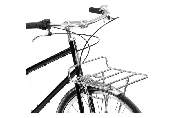 Porte-bagages avant en acier, avec plate-forme type porte-paquet, permet également d’accrocher des sacoches latérales, montage possible sur oeillets ou axe de la roue avant.