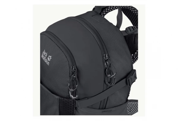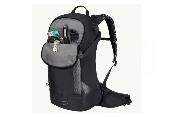 Le compartiment principal spacieux est élastique dans la partie avant. La poche avant accueille les petits objets. Vous pouvez ranger la veste de pluie mouillée dans un compartiment élastique à l’avant dont le volume se règle à l’aide des sangles de compression.