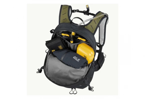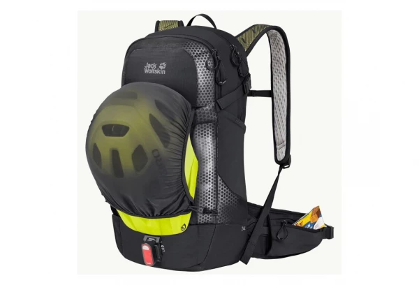 Les pochettes dans la poche avant sont conçues pour les outils et les accessoires de vélo et il y a une fixation pour la lampe LED ou la pompe à air. Le compartiment principal est élastique à l’avant, ce qui permet de l’agrandir un peu. Il y a également de la place pour une poche à eau. La fixation pour casque se trouve dans un compartiment séparé à l’avant.