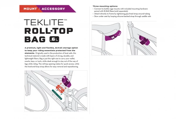 La sacoche de cadre Wolf Tooth B-RAD TekLite Roll-Top Bag est une option de rangement haut de gamme, légère et flexible, pour protéger vos essentiels contre les éléments. Elle suit le même profil que la sacoche Roll-Top B-RAD d’origine, mais utilise le nouveau matériau TekLite, composé de couches de fibres solides, durables et légères. La sacoche est suffisamment grande pour transporter une veste compressible ou de la nourriture pendant une journée complète sur la selle, mais suffisamment élégante pour rester à l’écart des jambes pendant la conduite. La fermeture par enroulement permet un accès rapide, tandis que la sangle auto-agrippante permet un retrait et un repositionnement faciles. Elle peut être attachée sous une selle, attachée aux tubes du cadre, fixée dans un porte-bidon ou montée sur n’importe quel support du système B-RAD.