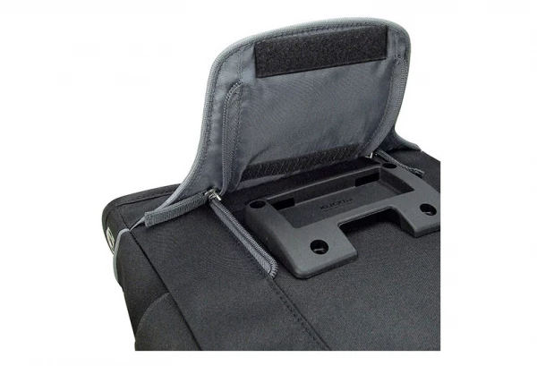 La plaque de fixation se cache derrière un rabat en tissu rembourré, transformant cette sacoche fonctionnelle en un sac à bandoulière très chic.
