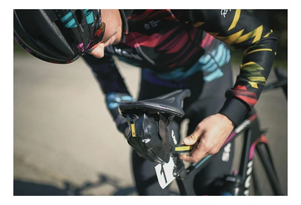 - Système de fixation : Sangles Velcro (rails de selle et tige de selle).