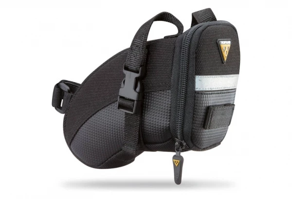 Sacoches de selle profilées, fixation par sangles sur les rails de la selle.